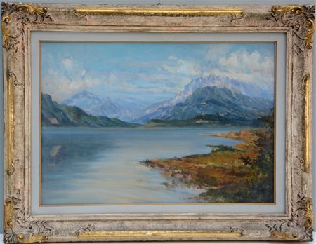 "Il lago di Pusiano" 1964, olio su compensato (cm 44x64) Firmato e datato in basso a destra. Alretro: firmato, titolato e datato. In cornice
