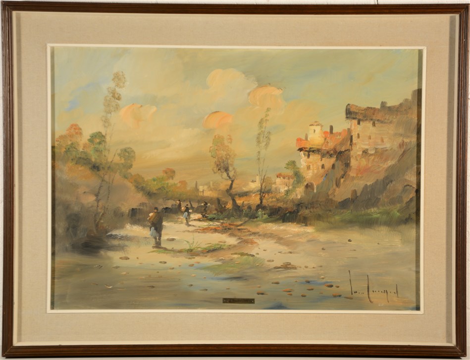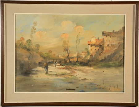 "Paesaggio con case e figure" olio su tela (cm 50x73) firmato in basso a destra. In cornice