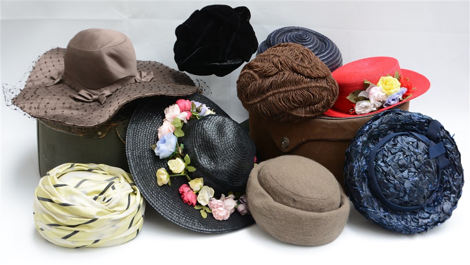 Lotto di nove cappelli per signora di fatture differenti uniti a due cappelliere rivestite in tessuto (difetti)