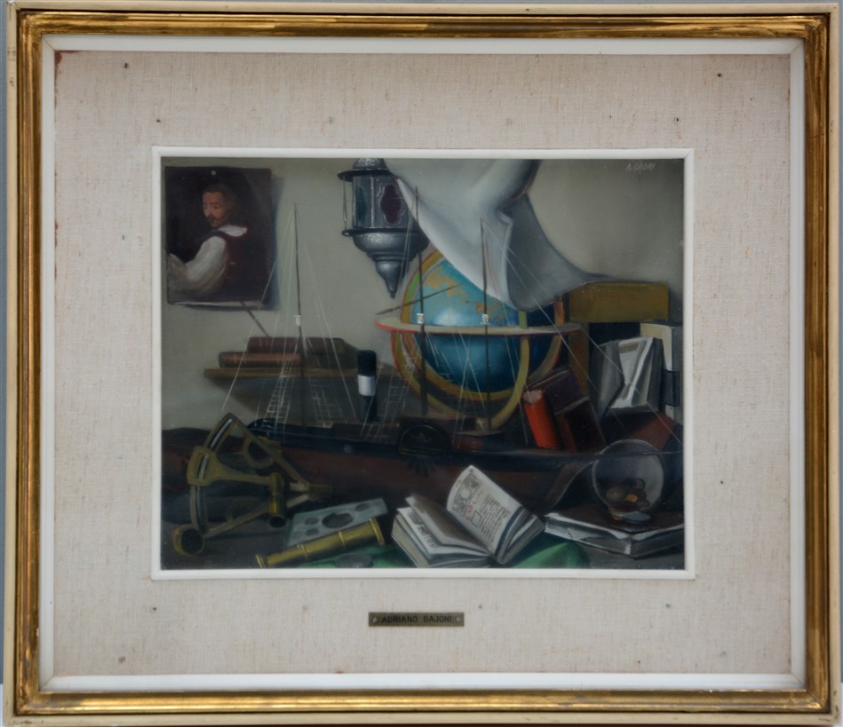 Adriano Gajoni "Lo scrittoio del viaggiatore" olio su faesite (cm 24x30) Firmato