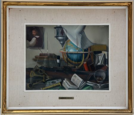 "Lo scrittoio del viaggiatore" olio su faesite (cm 24x30) Firmato in alto a destra. In cornice