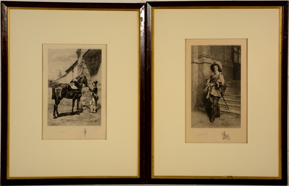 L. Ruet "Moschettiere" e "Soldato con cavallo" coppia di acqueforti da Meissonie
