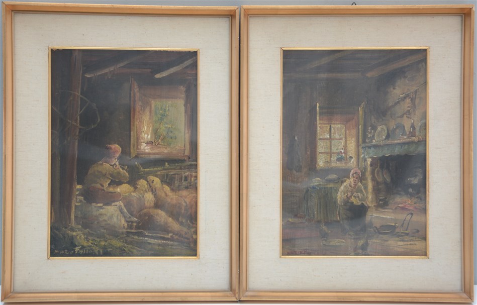 "In cucina" e "Nella stalla" due dipinti ad olio su cartone telato (cm 35x25) Firmati in basso a sinistra. In cornici