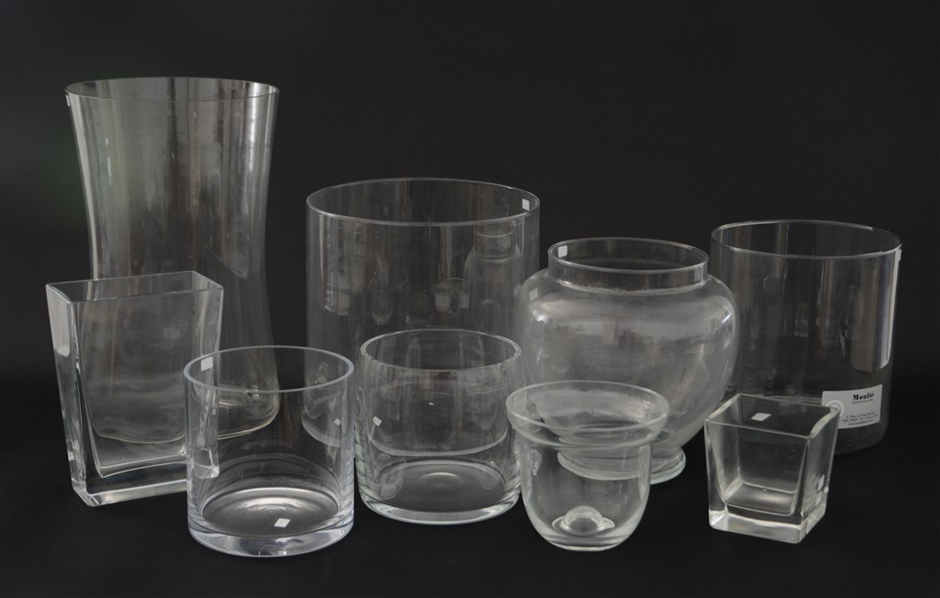Gruppo di nove vasi in vetro trasparente incolore di forme e dimensioni differenti (lievi difetti)