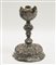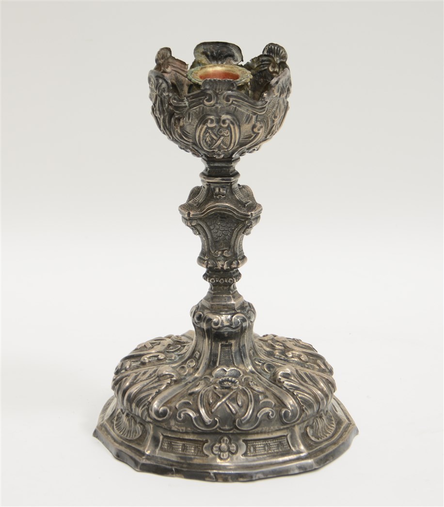 Candelieri in argento con corpo sbalzato a motivi vegetali e volute. Punzoni no
