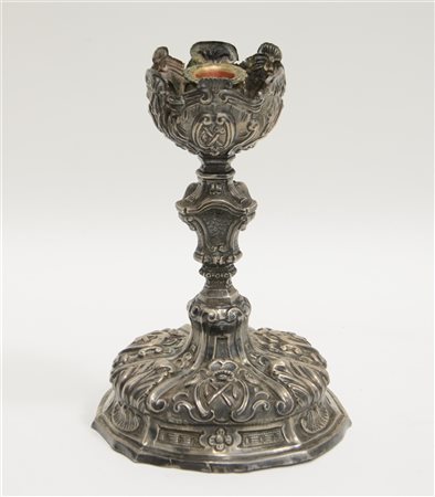Candelieri in argento con corpo sbalzato a motivi vegetali e volute. Punzoni non decifrati. Secolo XIX (h. cm 20) (difetti)