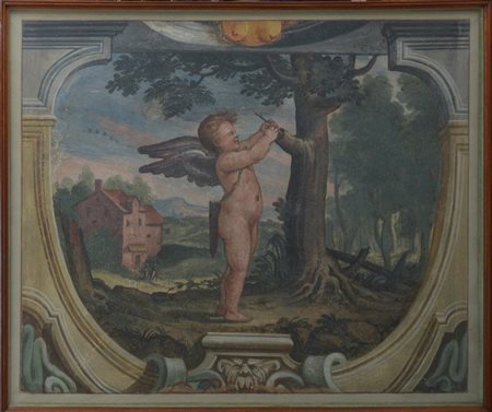 Ignoto del secolo XX "Putto in un paesaggio" strappo d'affresco (cm 117x139) In cornice (difetti)