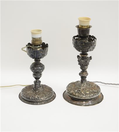 Lotto composto da due candelieri in argento di diversa epoca montati a luce elettrica (difetti e mancanze)