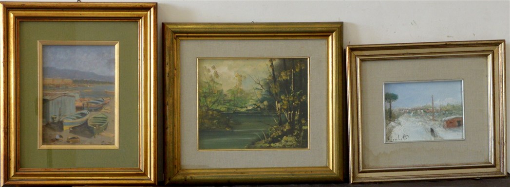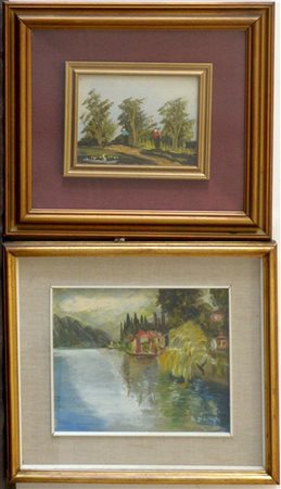 Gruppo di cinque dipinti ad olio raffiguranti "Paesaggi". Autori, supporti e misure differenti, in cornici. Uno dei cinque firmato Gaetano Bocchetti (Napoli 1888-1990) (lievi difetti)