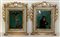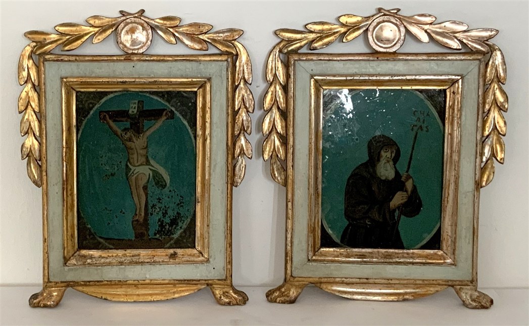 Ignoto, "Santo" e "Cristo in croce" coppia di verre peint (cm 20,5x16 ciascuno) in cornici in legno scolpito, laccato e dorato (difetti e rotture)