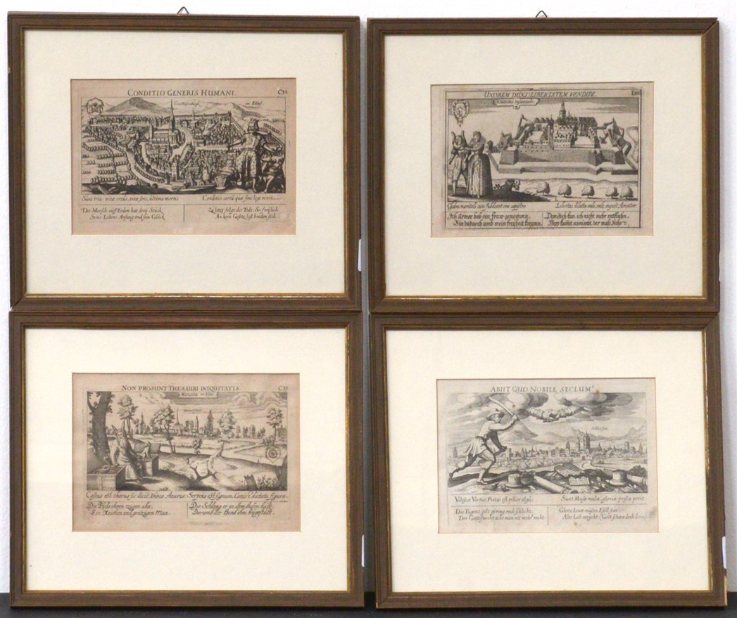 Gruppo di quattro antiche incisioni raffiguranti città fortificate (cm 11x16) In cornici (difetti)