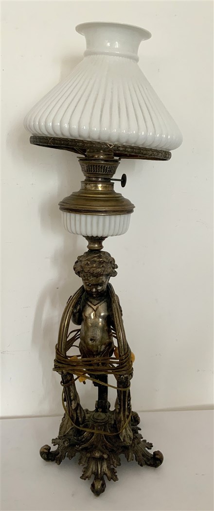 Lampada ad olio in bronzo con vasca e paralume con opaline bianco e corpo con putto a tutto tondo (h. cm 67) Montato a luce elettrica in epoca posteriore (difetti)