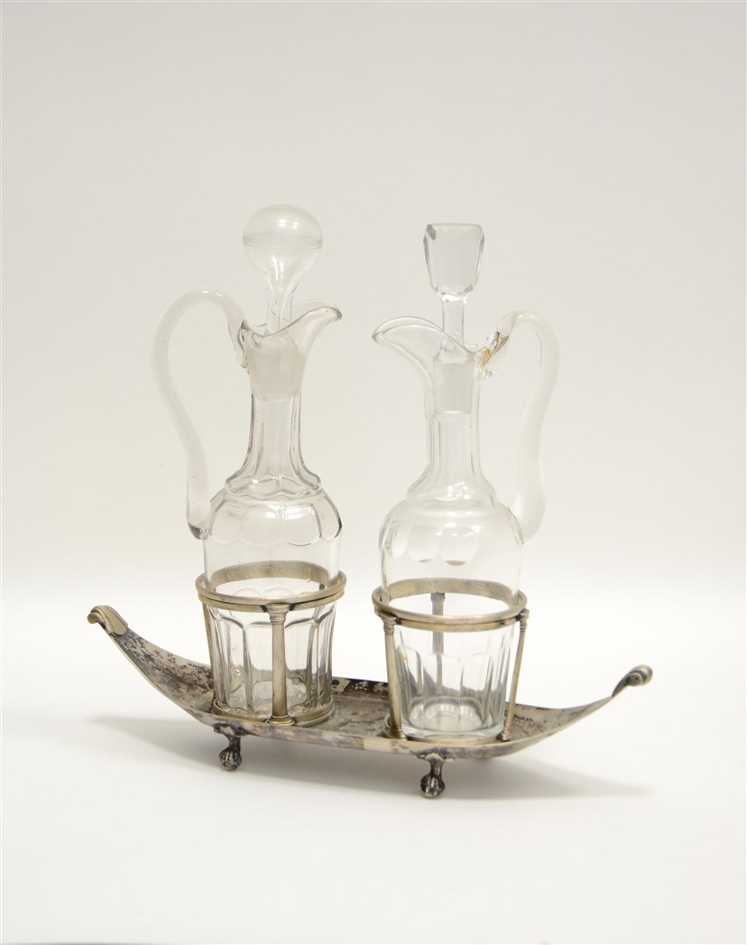 Porta-cruet a barca in argento con anse stilizzate e piedi ferini. Marchio di Napoli. Secolo XIX (g 500 ca.)