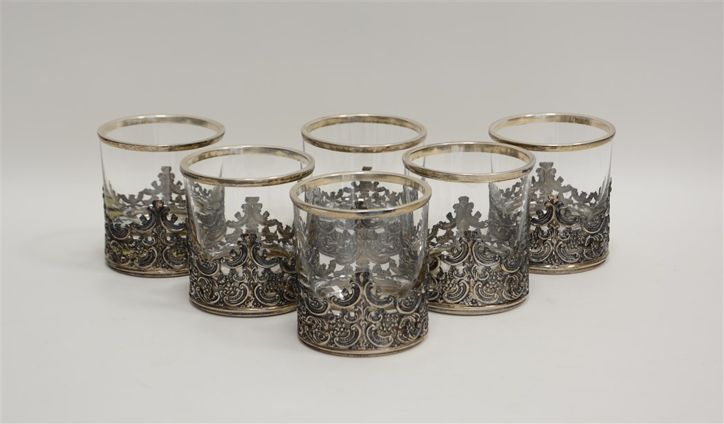 Lotto 1472 | Gruppo di sei bicchieri da whisky con basi in argento decorate a volute. Titolo