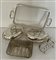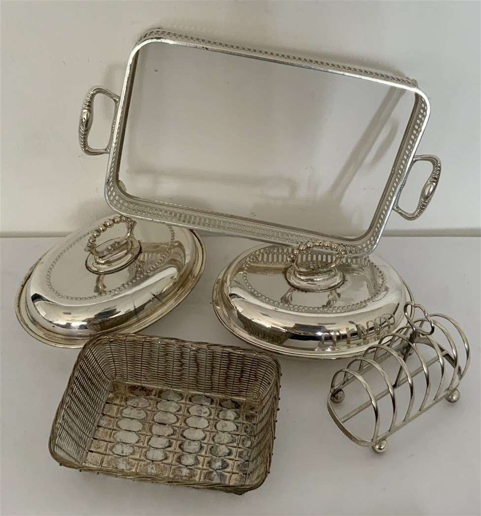 Lotto composto da due legumiere, un porta-pirofila, un porta-toast e un cestino in metallo argentato (difetti)