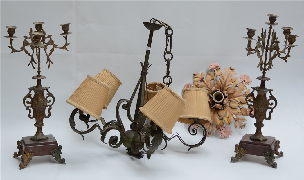 Lotto composto da una coppia di candelabri a quattro fiamme in metallo su basi di marmo rosso, un lampadario a cinque luci in ferro battuto e una plafoniera in metallo dipinto a motivi floreali (difetti e mancanze)