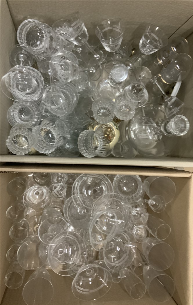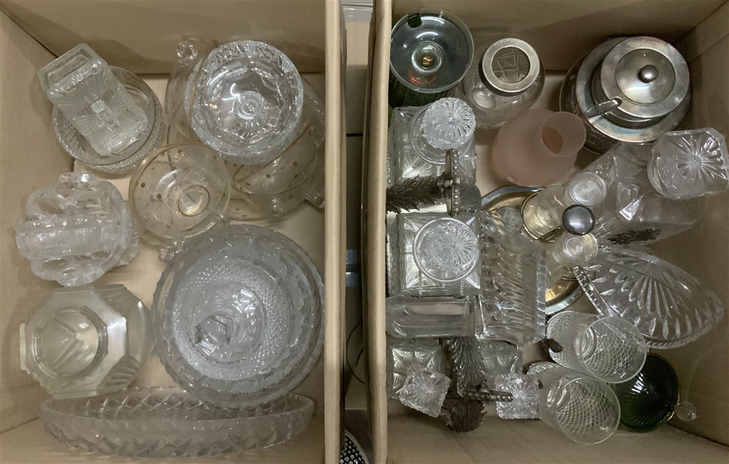 Quattro cartoni contenenti numerosi oggetti in vetro di diverso uso e fattura (