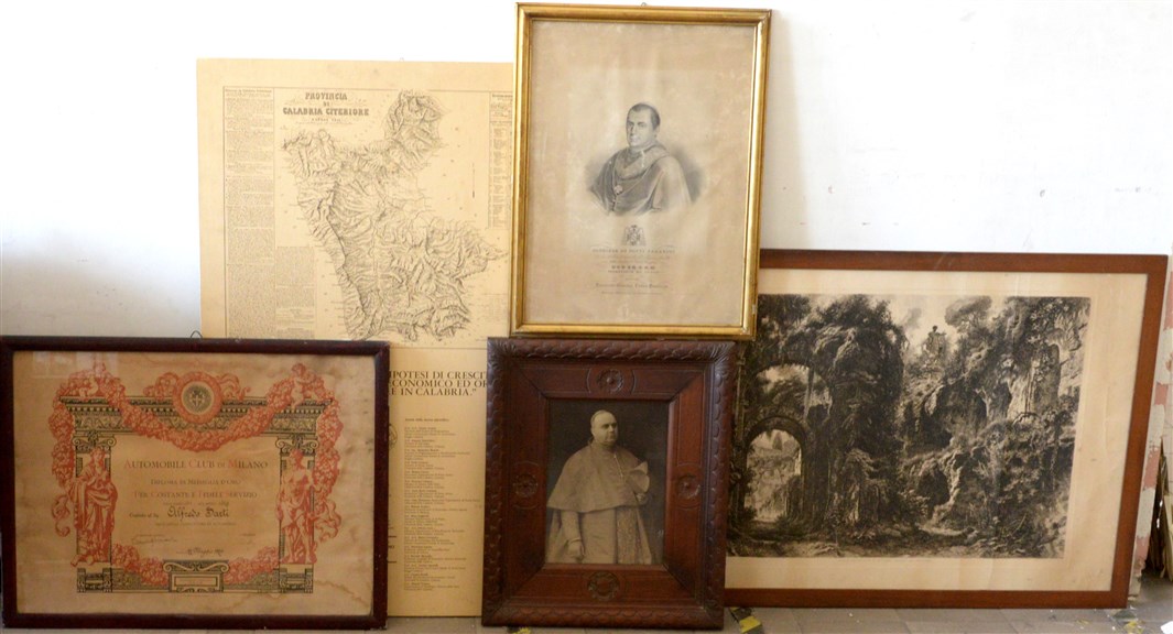Lotto composto da un’incisione con rovine, una mappa dei territori calabri, un diploma, una foto e un’incisione ritraenti papi, in cornici (difetti)