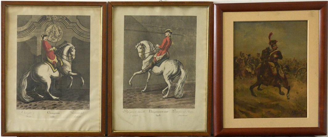 Lotto composto da una oleografia e due riproduzioni a colori raffiguranti caval