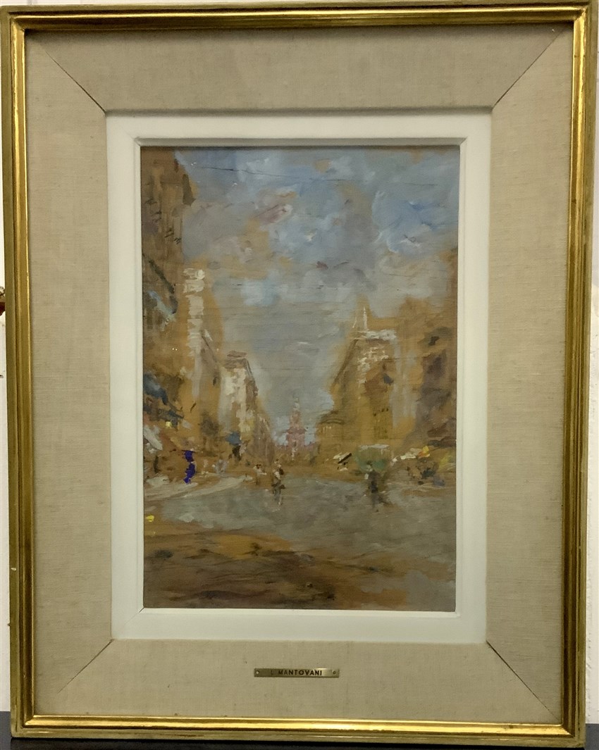 Luigi Mantovani "Milano. Via Dante" olio su compensato (cm 37x25) Firmato in bas