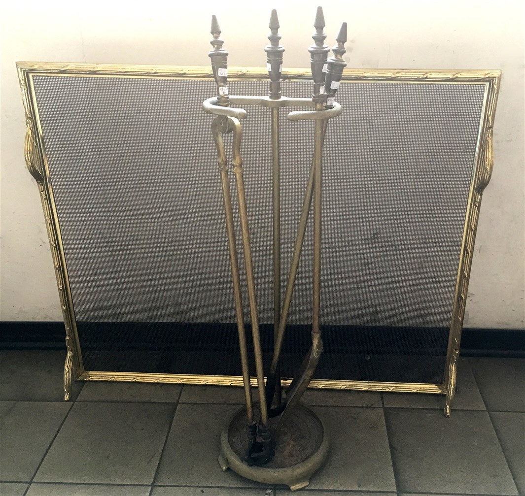 Fornitura da camino composta da un parascintille e un porta attrezzi con pinze, paletta e attizzatoio (difetti)