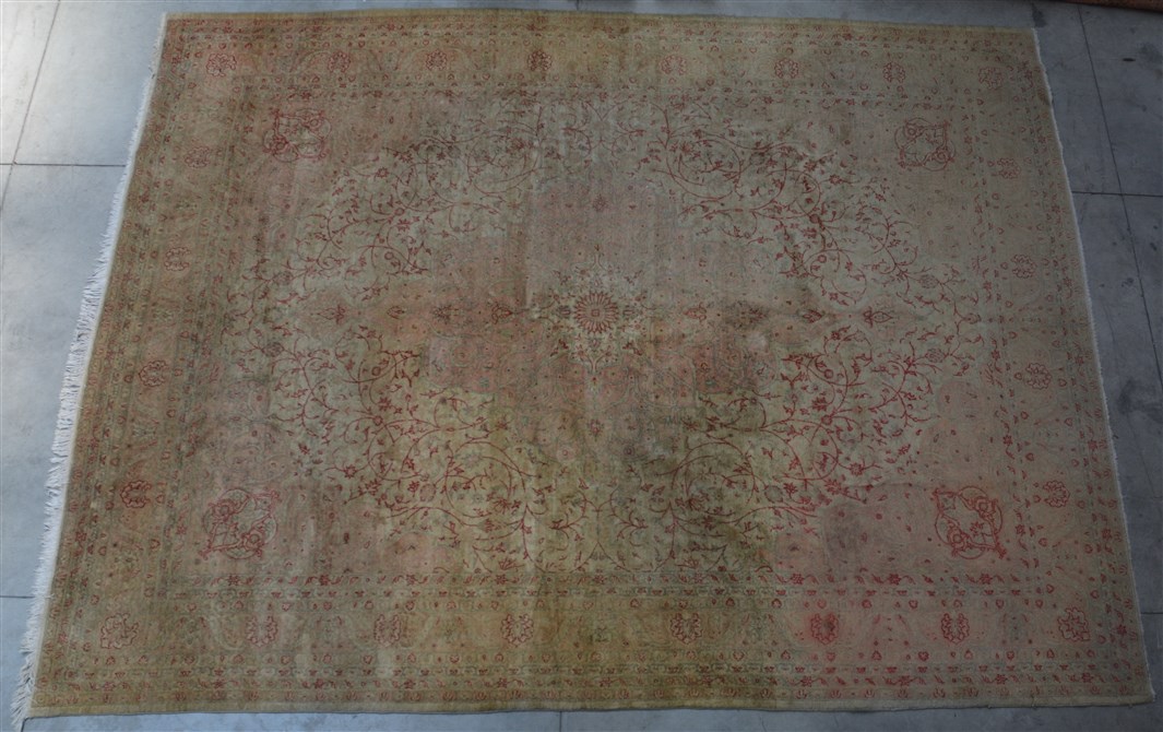 Decoro a medaglione con puntali nei toni del rosa, azzurro e rosso su fondo beige, cosparso di rami fioriti. Bordura Herati (cm 362x272) (gravi difetti tagli e sbavature)