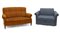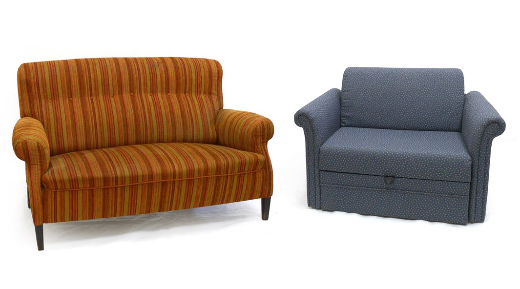 Lotto composto da un divano a due posti con tessuto a righe e una poltrona letto con tessuto blu (difetti)