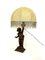 Lampada da tavolo ad una luce con fusto in legno scolpito a forma di putto, paralume in tessuto con perline (h tot cm 73) (difetti e mancanze)