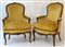 Coppia di poltrone con cimasa intagliata a fiori, braccioli scanalati, gambe mosse, rivestite in velluto color ocra (difetti)