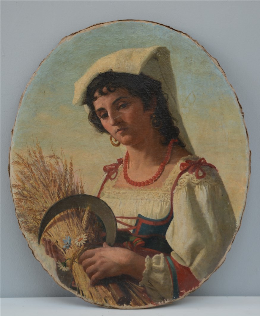 Scuola del XIX Secolo "Spigolatrice ciociara" olio su tela ovale (cm 65x54) (difetti)