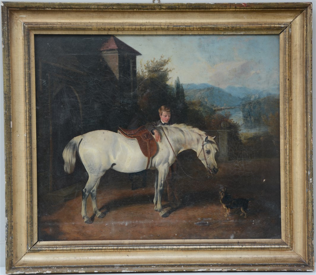 Monogrammista inglese della seconda metà del XIX Secolo "Paesaggio con fanciulla e cavallo" olio su tela (cm 56x66) Siglato in basso a sinistra. In cornice (difetti)