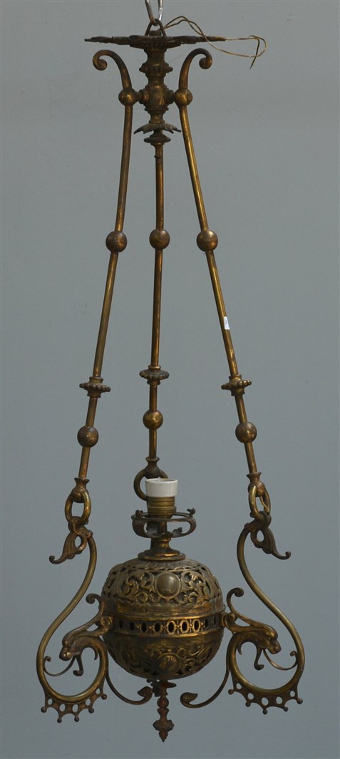 Lampadario in bronzo di forma di forma globulare decorato in rilievo e traforato, tre bracci ricurvi a forma didraghi stilizzati (h cm 90)(difetti e mancanze)