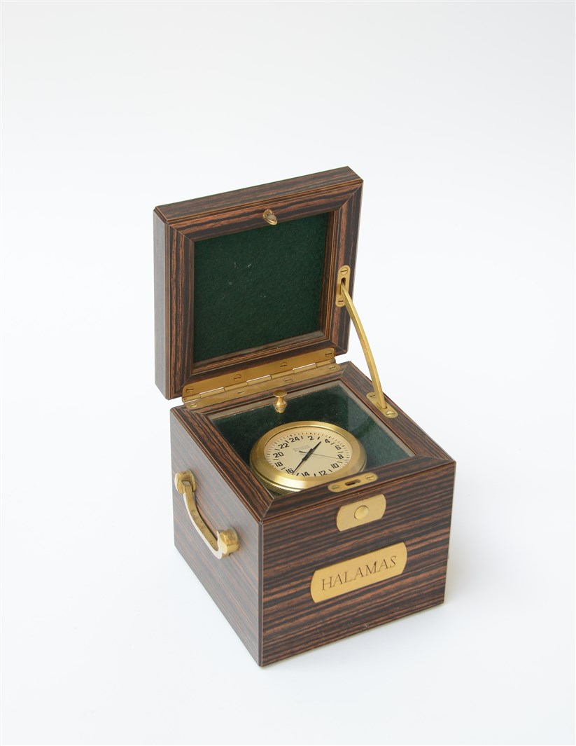 Orologio in metallo con quadrante con numeri arabi , in custodia in legno