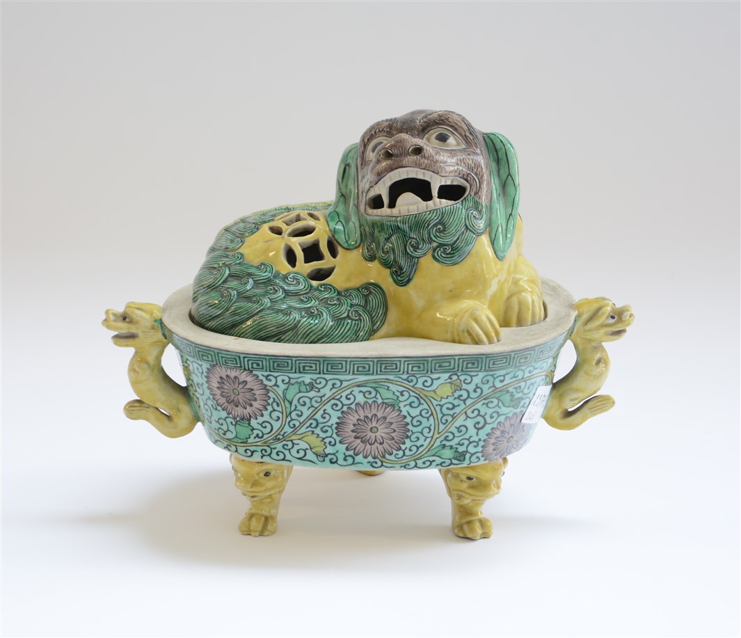 Brucia incenso in porcellana a smalti famiglia verde con coperchio a forma di leone buddista. Cina, secolo XX (lungh. max cm 24) (difetti e mancanze)