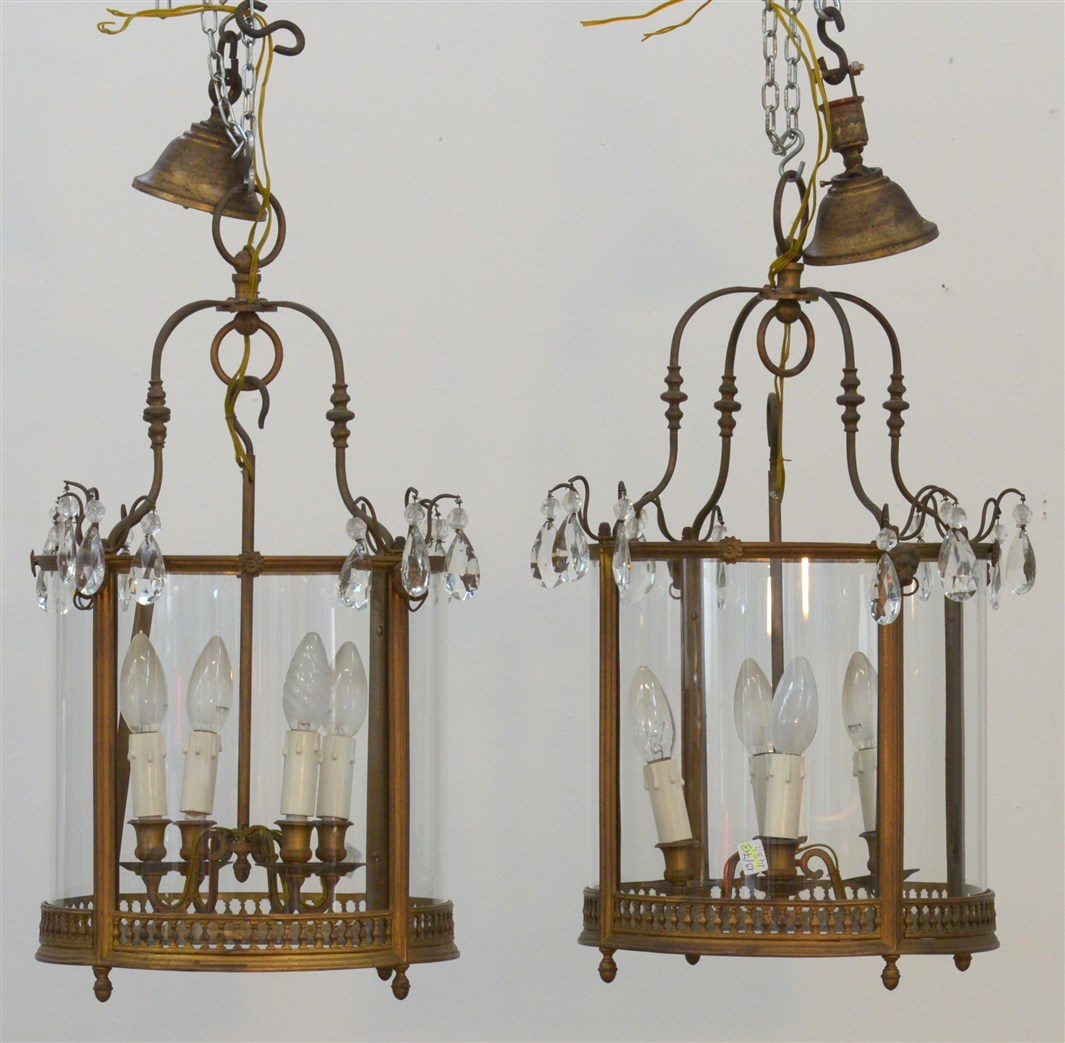 Coppia di lanterne a quattro bracci in bronzo dorato con pendenti in vetro. Sec
