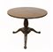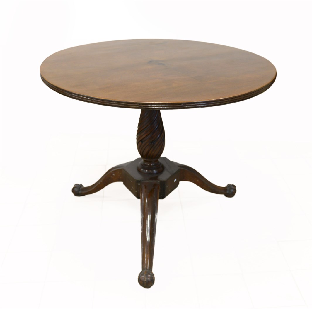Tavolo tondo con piano lastronato, gamba centrale tornita e scanalata, tre pied