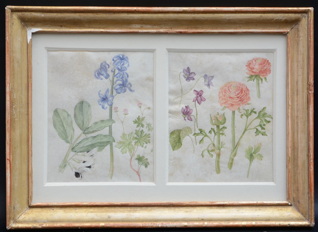 Ignoto "Nature morte con fiori" coppia di dipinti su pergamena (cm 20,5x16,5 ciascun foglio) in un'unica cornice (difetti)