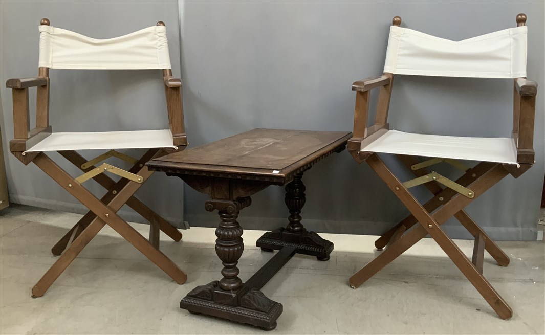 Lotto composto da un tavolino da salotto in stile rinascimentale e due poltroncine pieghevoli (difetti)
