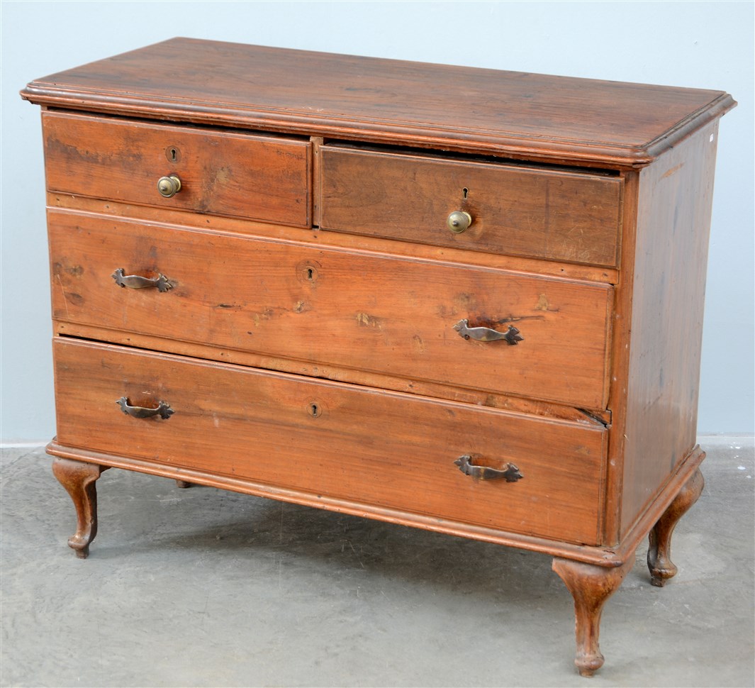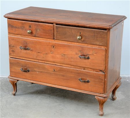 Piccolo comò in noce a due cassetti grandi e due in linea sottopiano. Quattro piedini sagomati sec. XVIII (cm 104x83x48)(difetti e restauri)