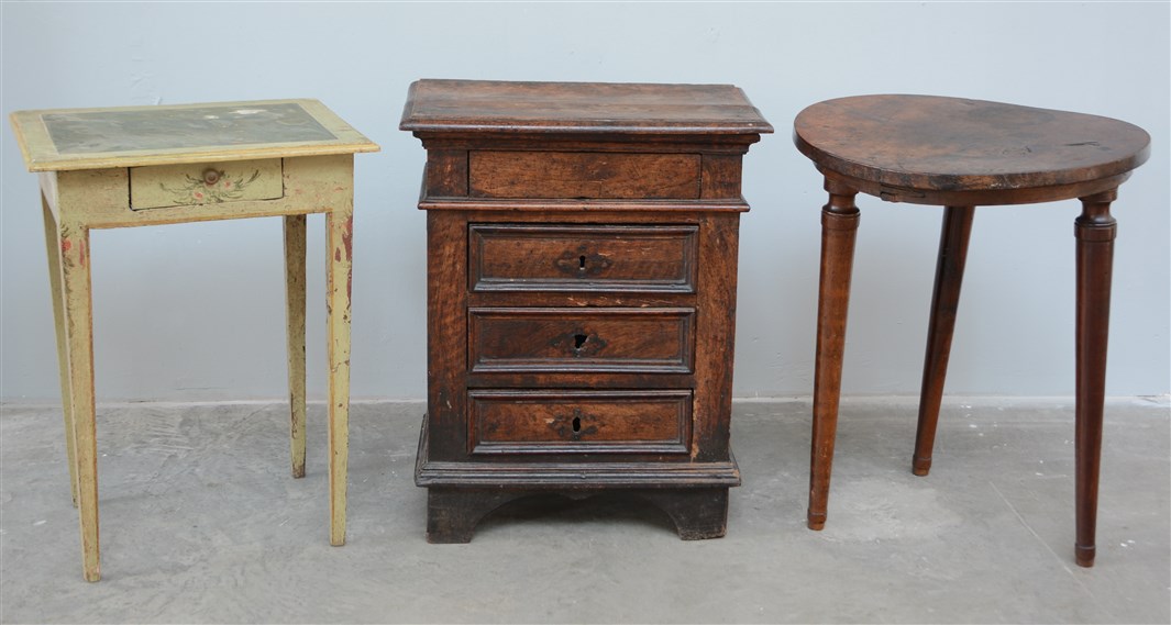 Lotto composto da due tavolini d'appoggio, uno tripode con gambe tornite, l'altro laccato con cassettino nella fascia uniti ad un antico comodino a quattro cassetti (misure diverse)(difetti)