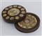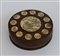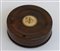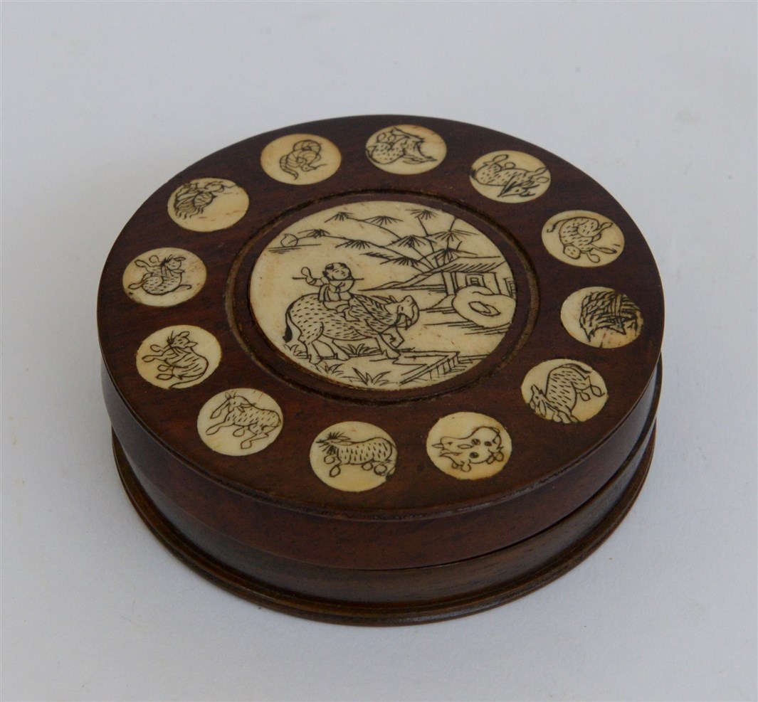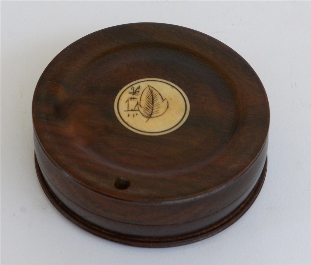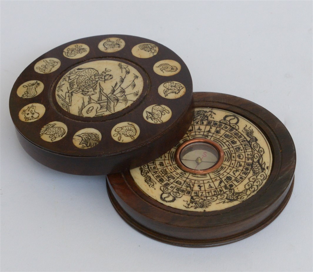 Bussola in legno decorata con inserti in avorio inciso con inscrizioni e segni dello zodiaco (d cm 8)
