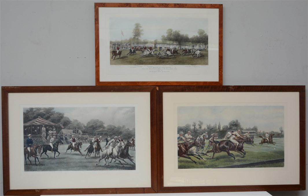 Lotto composto da tre incisioni di diversa epoca raffiguranti giocatori di polo, in cornici (difetti)