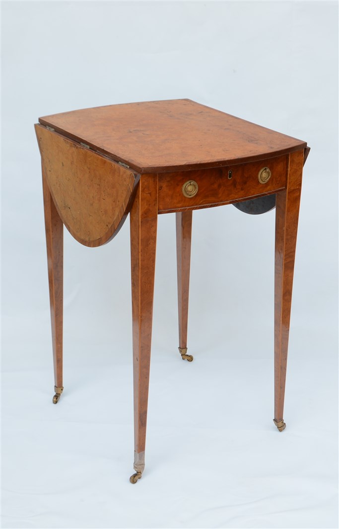 Tavolino ad alette lastronato in radica e filettato in legni vari, ad un cassetto nella fascia, gambe rastremate terminanti a rotelle. Inghilterra, secolo XIX (cm 74x50x42) (difetti)