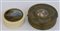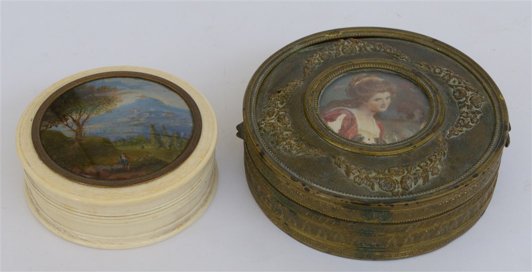 Lotto di due scatoline tonde, una in avorio con coperchio centrato da un paesaggio dipinto, ed una del secolo XIX in ottone con ritratto femminile su avorio (d cm 9 e cm 12) (difetti)