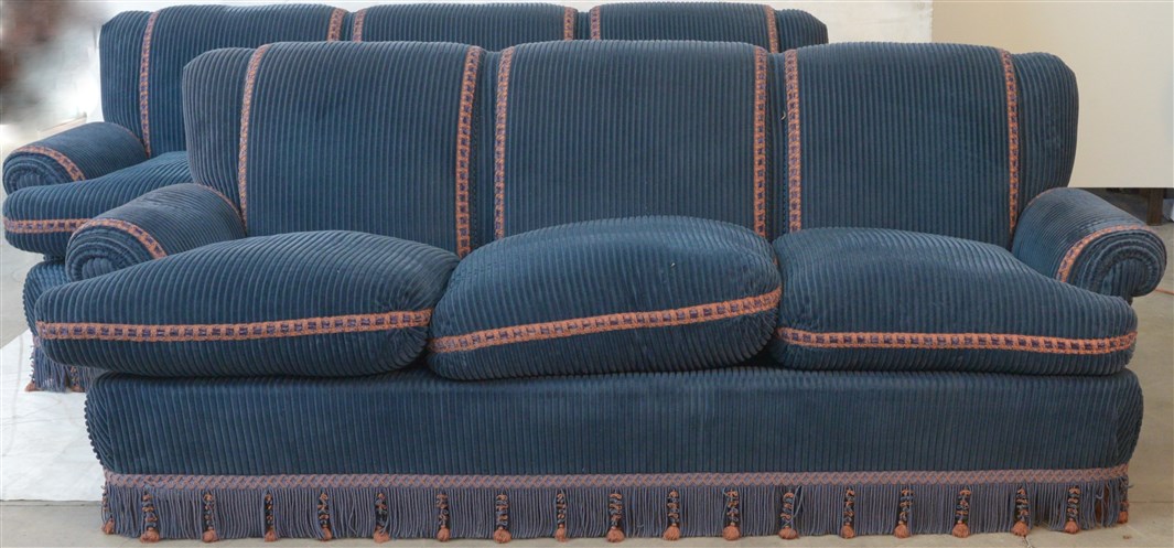 Coppia di divani a tre posti ricoperti in velluto blu (difetti)