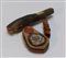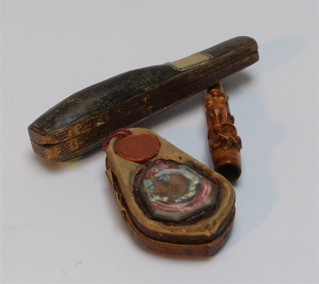 Lotto composto da una reliquia dentro un pendente in cristallo e un bocchino in legno e ambra con figura femminile in altorilievo, in custodie (difetti)