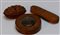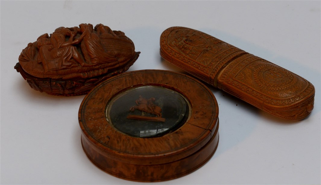 Lotto di tre contenitori in legno con figure intagliate (difetti)