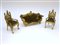 Fornitura da salotto in miniatura composta da un divano e una coppia di poltrone di stile differente, metallo dorato e sedute asportabili rivestite in tessuto (h max cm 11) (difetti)
