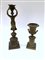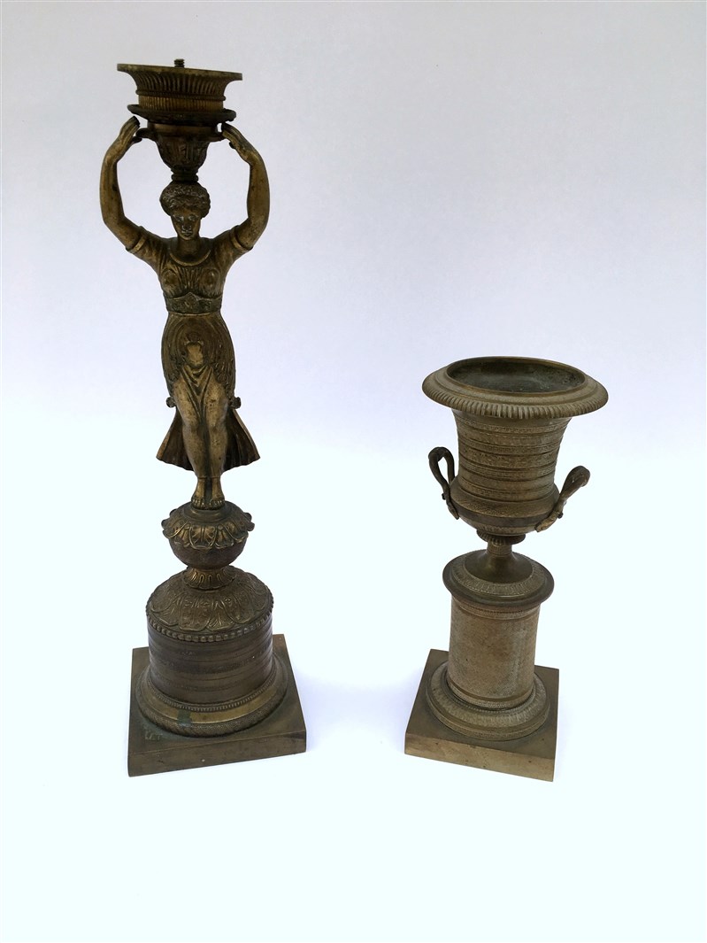 Lotto composto da un vasetto biansato in bronzo montato su colonna e una struttura per lampada in bronzo con figura femminile (h max cm 39) (difetti e mancanze)