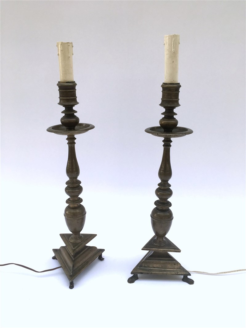 Coppia di porta ceri in bronzo con fusto tornito su base tripode, montati a luce elettrica (h cm 42) (difetti)